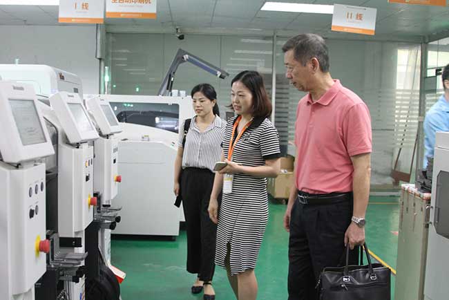 在智慧城市的浪潮中,基础配套必须先行,在参观全自动化生产车间时,张晓新教授频频发问:机器效率和人工相比怎样?月产能怎样?公司这样的机器有多少台?营销经理杨芬在旁全程微笑回复,专业的解说得到张晓新教授高度赞誉。