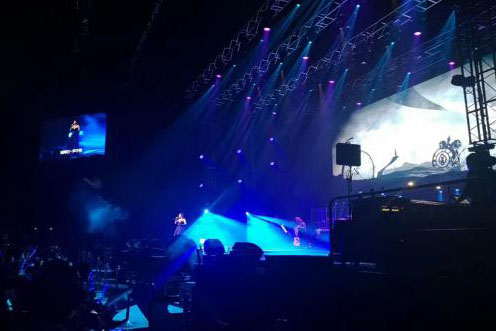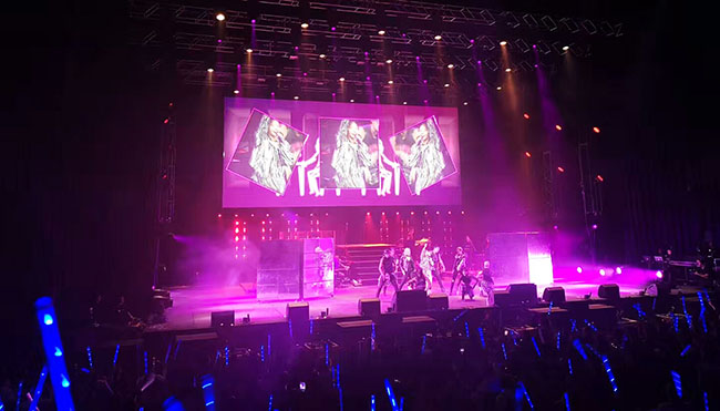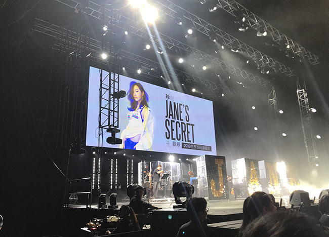 为了保证坐在后排及侧边的歌迷能清楚地看到台上演出的情景,此次主办方在设计上采用了常用且经典的造型——舞台中间设有一个