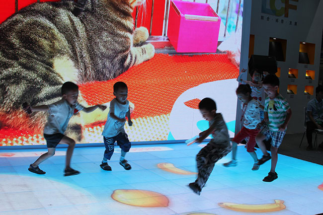 童真、童趣,在多宝电竞展区里,LED屏真正实现“一屏多用”,互动地砖屏成为了孩子们的游乐场。